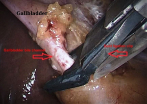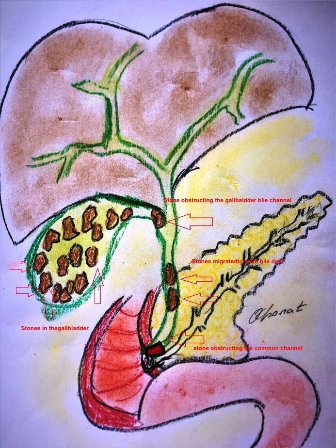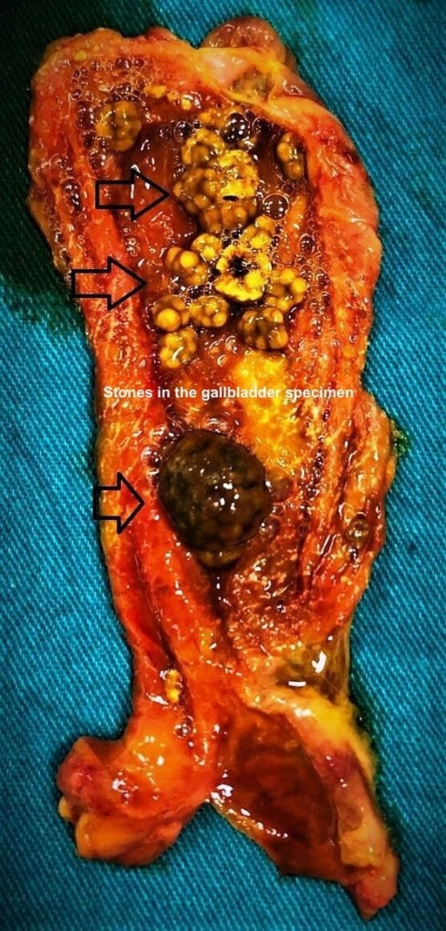 Liquids are started 4 hours after surgery, solid food after 12 hours. Patients are mobilized after 6 hours. Pain is mild and usually resolves within 2 days. Discharge is typically after 24 hours. Sutures are removed after 7 days. There is no special postoperative diet, and routine follow-up is unnecessary unless symptoms occur.Figure: Gallstones in the gallbladder and stones obstructing the cystic duct and common bile duct